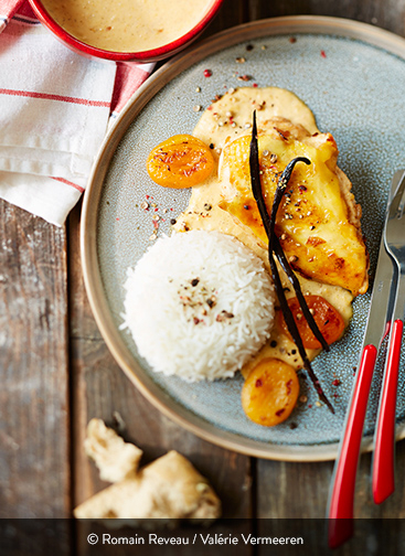 Dressez les assiettes en disposant une boule de riz, un filet de poulet. Nappez de sauce, ajoutez les amandes effilées et la branche de groseille pour apporter une pointe d’acidité.