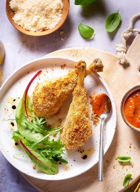 Trempez bien chaque pilon dans le lait, roulez-le ensuite généreusement dans la chapelure et déposez-le dans le plat. Saupoudrez un peu du parmesan restant sur chaque pilon et enfournez pour 30mn.